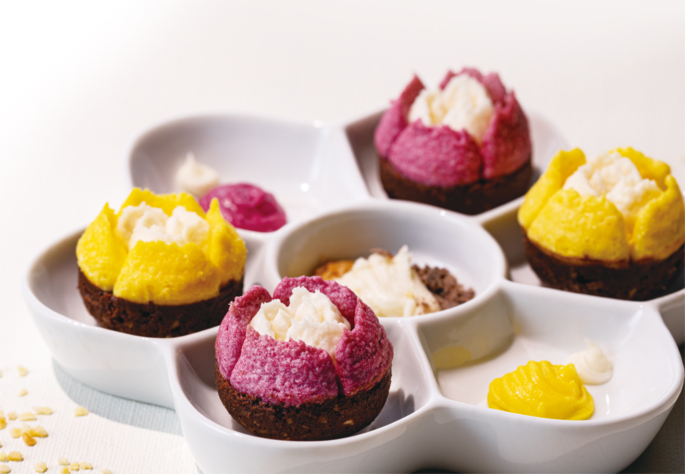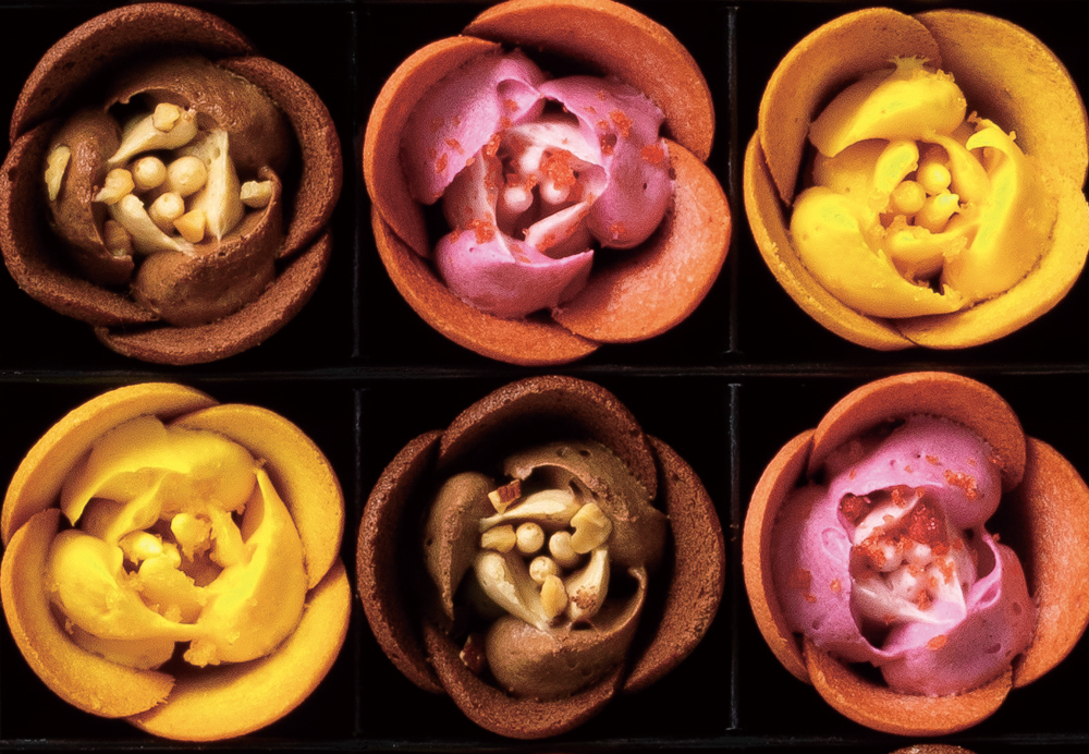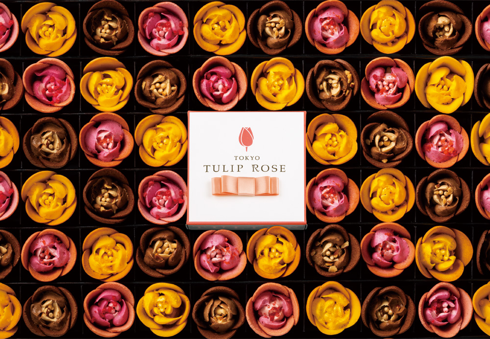 代表作「チューリップローズ」は、ラングドシャクッキーのチューリップの中に、ホイップショコラのローズが咲き、「スイーツの花園」のよう。