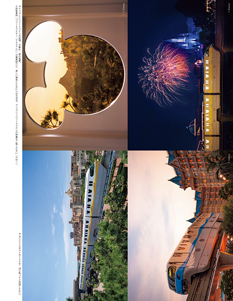 ディズニーリゾートラインの昼間、夕暮れ、夜の風景をポストカードが特別付録。