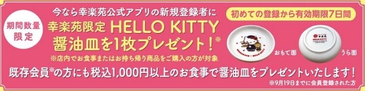 幸楽苑公式アプリに新規登録された方に、幸楽苑限定ハローキティ 醤油皿が1枚プレゼントされます☆