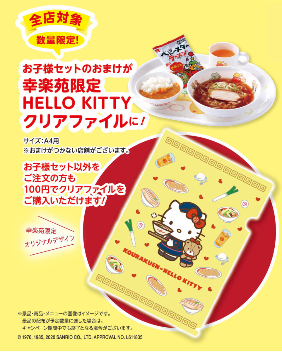 キャンペーン期間中、お子様セットのおまけが幸楽苑限定「ハローキティ」クリアファイルに変更されるほか、オリジナルデザインの醤油皿とクリアファイルを全店舗にて販売。