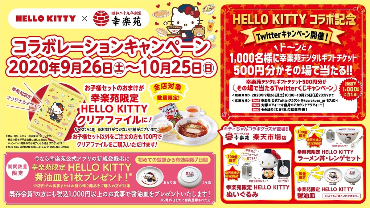 幸楽苑の「ハローキティ」コラボレーションキャンペーンは、2020年9月26日よりスタートです☆