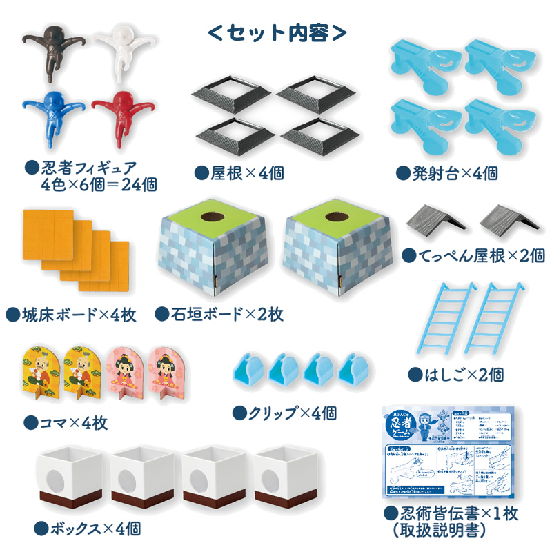 セット内容:忍者フィギュア 4色×6個=24個、屋根×4個、発射台×4個、城床ボード×4枚、石垣ボード×2枚、てっぺん屋根×2個、はしご×2個、コマ×4枚、クリップ×4個、ボックス×4個、忍術皆伝書(取扱説明書)×1枚