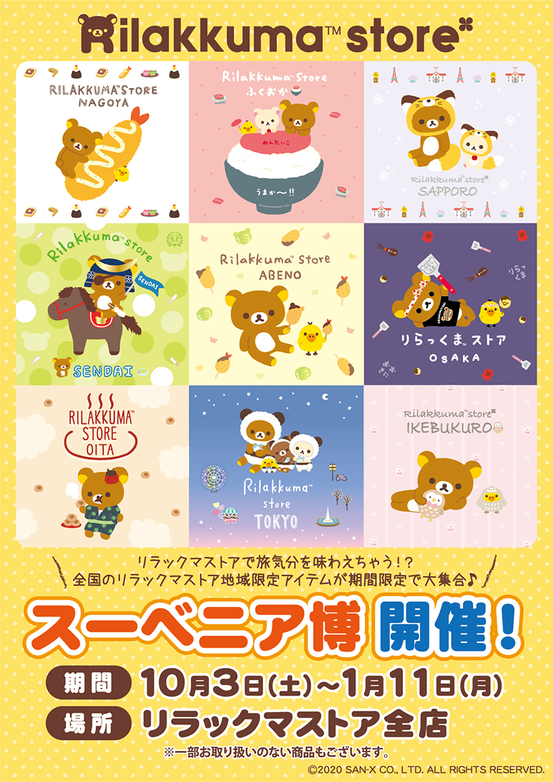 「スーベニア博」は、リラックマストア全店にて、2020年10月3日(土)から2021年1月11日(月)まで開催です。