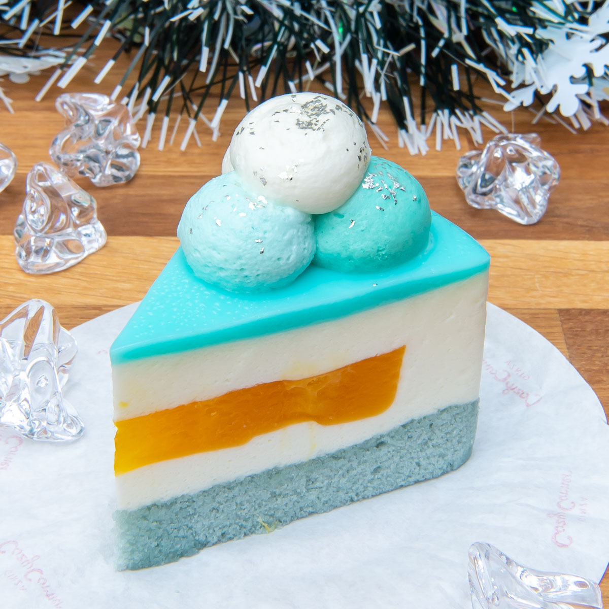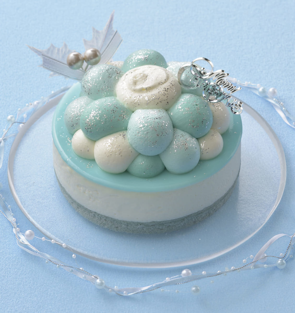 ライチ、ミント、チーズ、3種のクリームをもこもこと絞り、空に浮かぶ雲を表現した「もこもこハッピークリスマス(5号)」