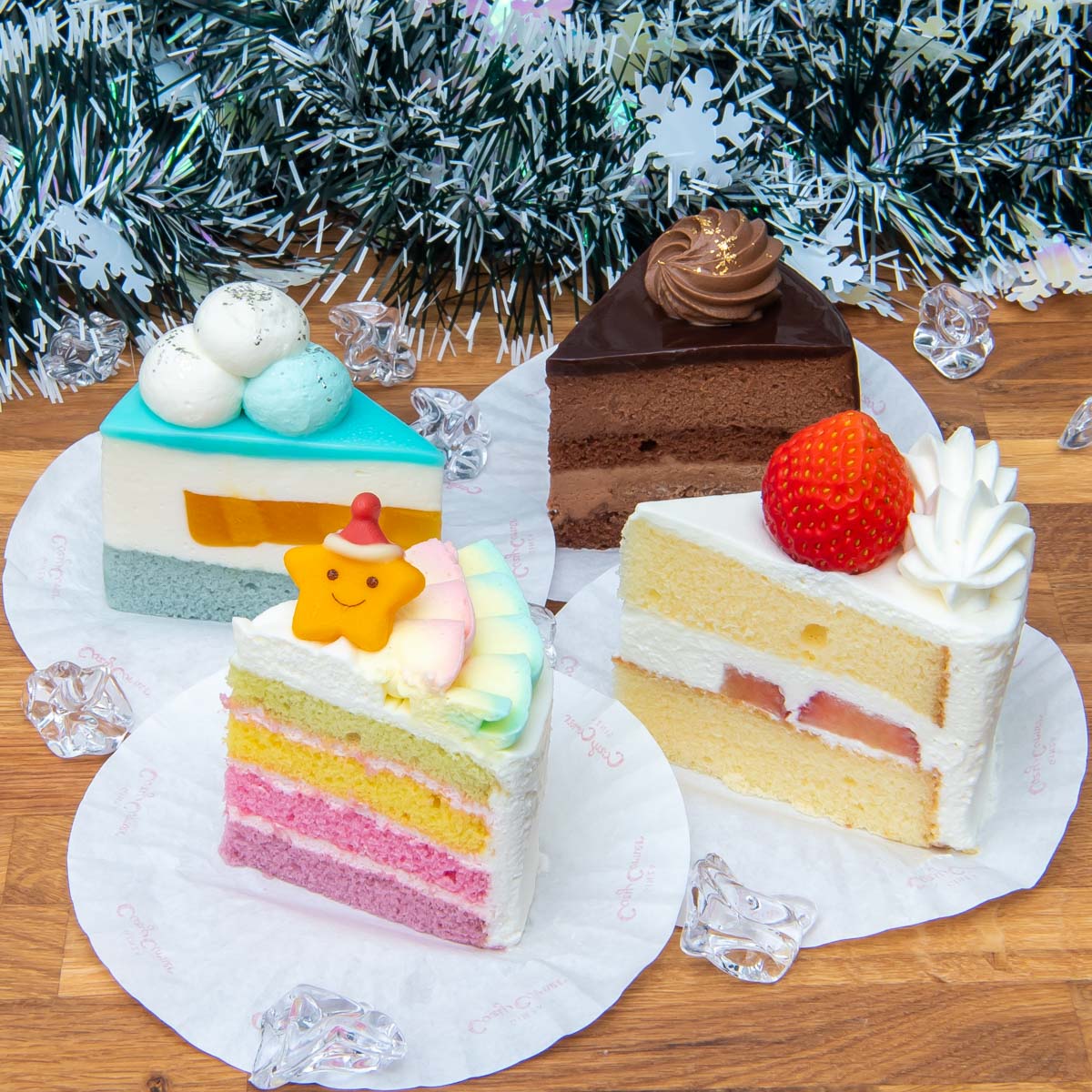 「サンタクロース」の苺クリームタルト、「リース」のチョコクリームケーキ、雪だるまにトナカイ。