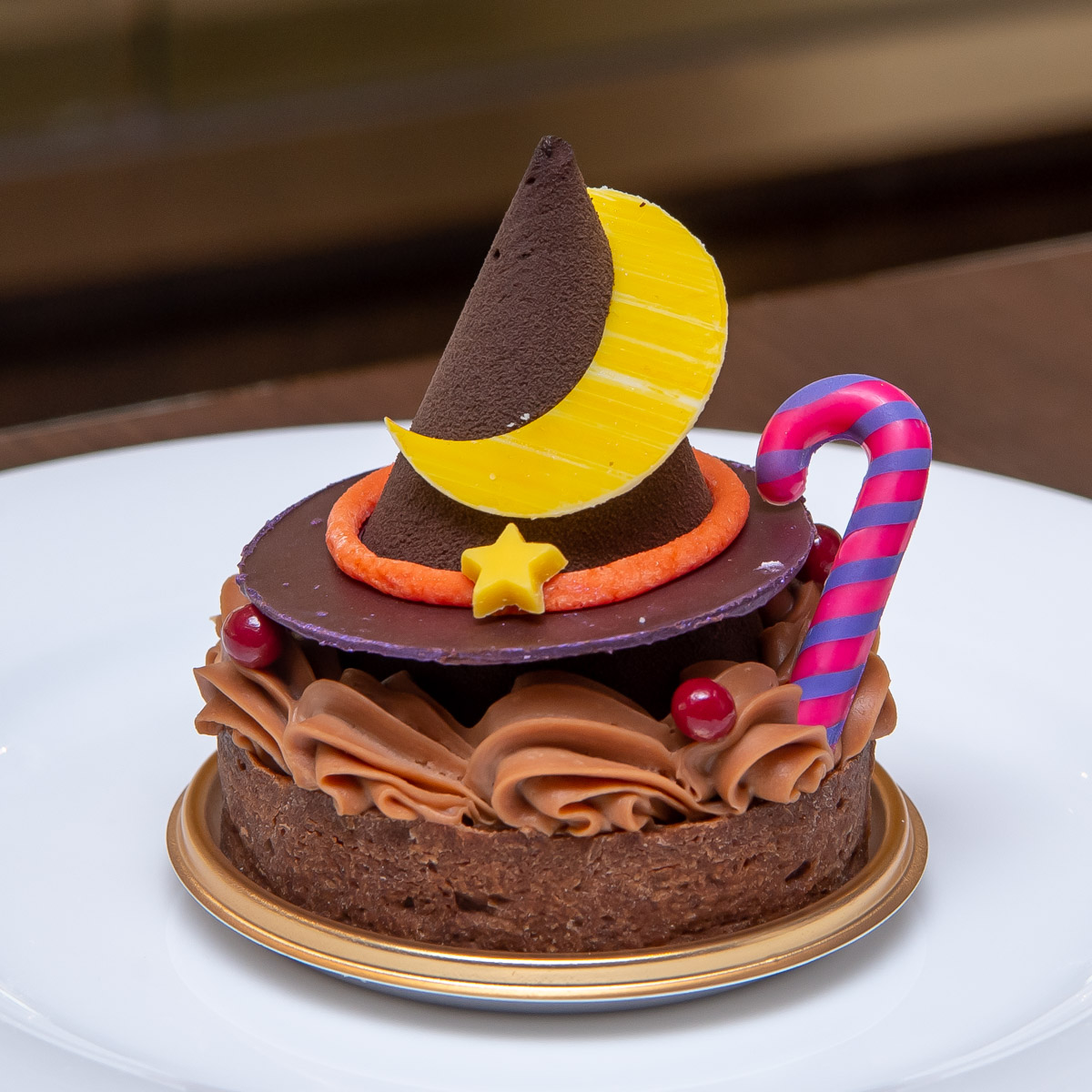 三角帽子とステッキがかわいらしいチョコレートケーキ。