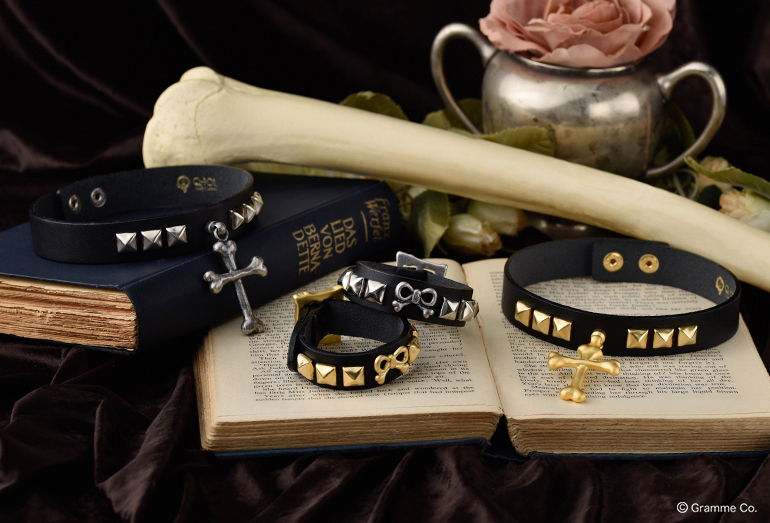 スタッズがあしらわれたゴシックテイストな本革のブレスレットやチョーカーも登場。
