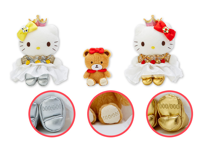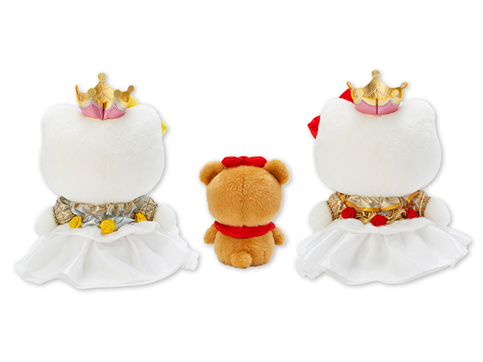 王冠やバラ、ゴールドとシルバーで飾られた豪華なドレスの「ハローキティ」と「ハローミミィ」とおともだちのタイニーチャムがセットになったバースデードールは、Sanrio Puroland Online Shopにて抽選で販売。