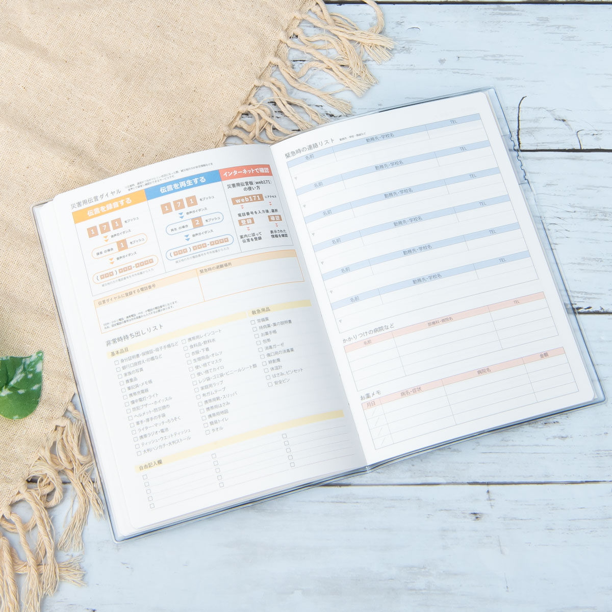 便覧ページは災害用伝言ダイヤル・非常時持ち出しリスト、緊急時の連絡リストなどを収録。