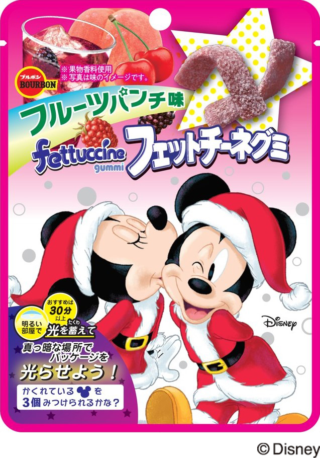 サンタクロースの衣装を着た「ミニーマウス」が「ミッキーマウス」のほっぺにキスをするシーンがプリントされた「フェットチーネグミXmasフルーツパンチ味」