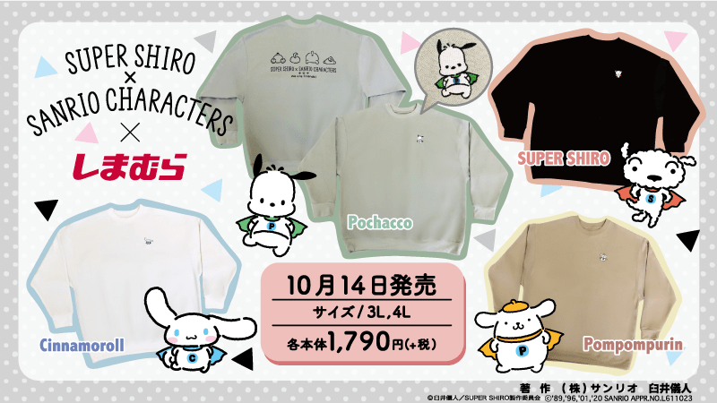 「SUPER SHIRO(スーパーシロ)」と、サンリオキャラクターズの「シナモロール」、「ポムポムプリン」、「ポチャッコ」がコラボしたスウェットは、しまむらオンラインショップで2020年10月14日(水)から販売開始、ガシャポンは2020年12月登場予定となっています。