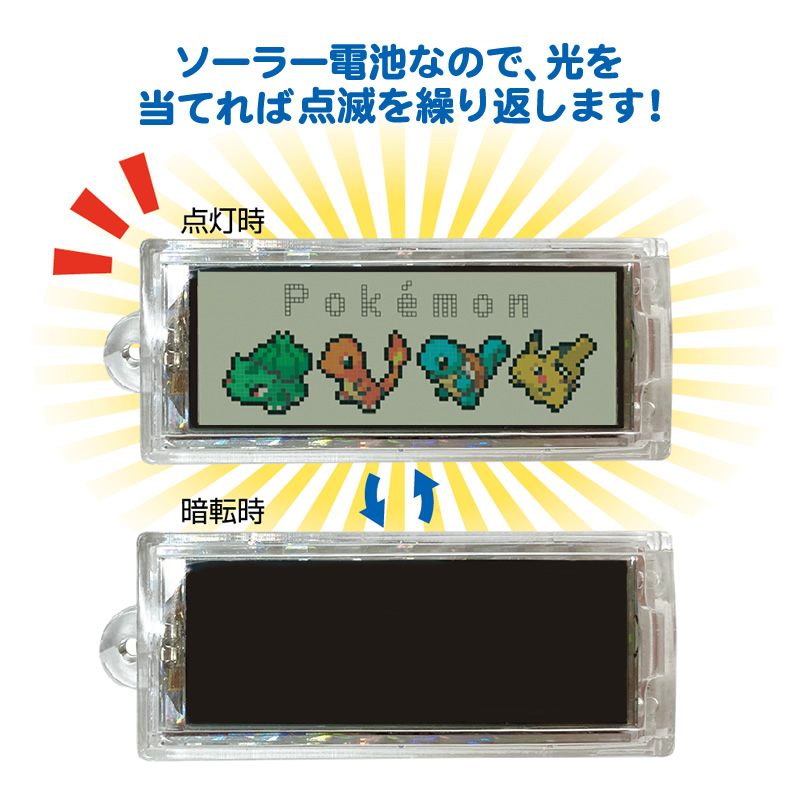 光が当たると「フシギダネ」「ヒトカゲ」「ゼニガメ「ピカチュウ」が表示される、ソーラー電池を使った楽しい仕掛け付きです☆