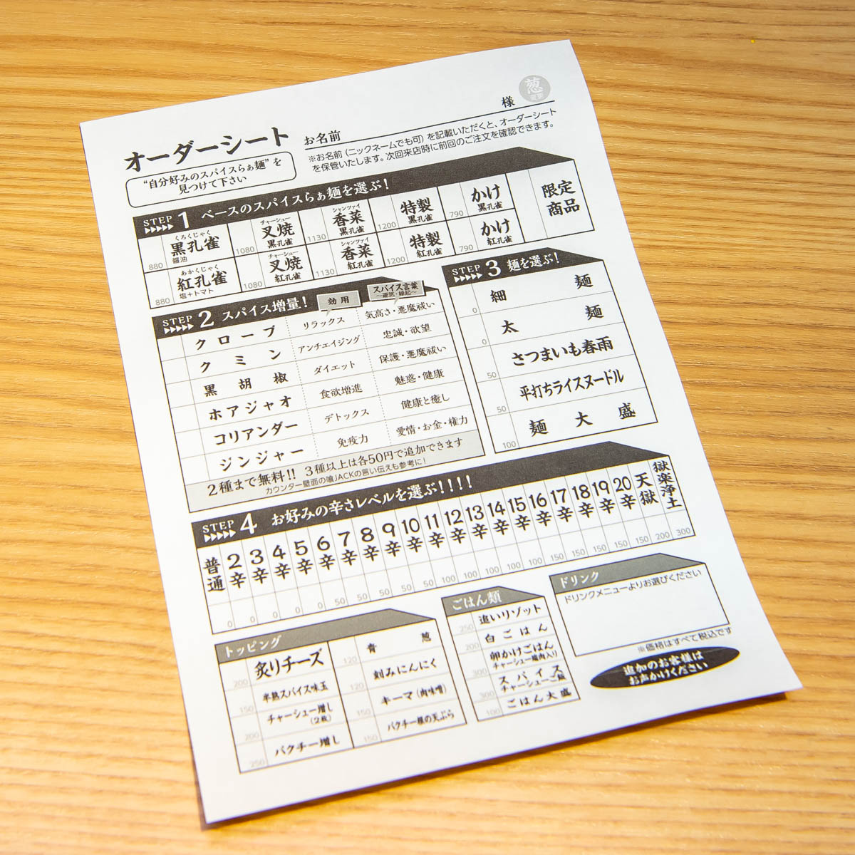 オーダーシートを使って、「自分だけ」の好みの味を見つけるのも楽しいスパイスらぁ麺 喰JACK (くじゃく)