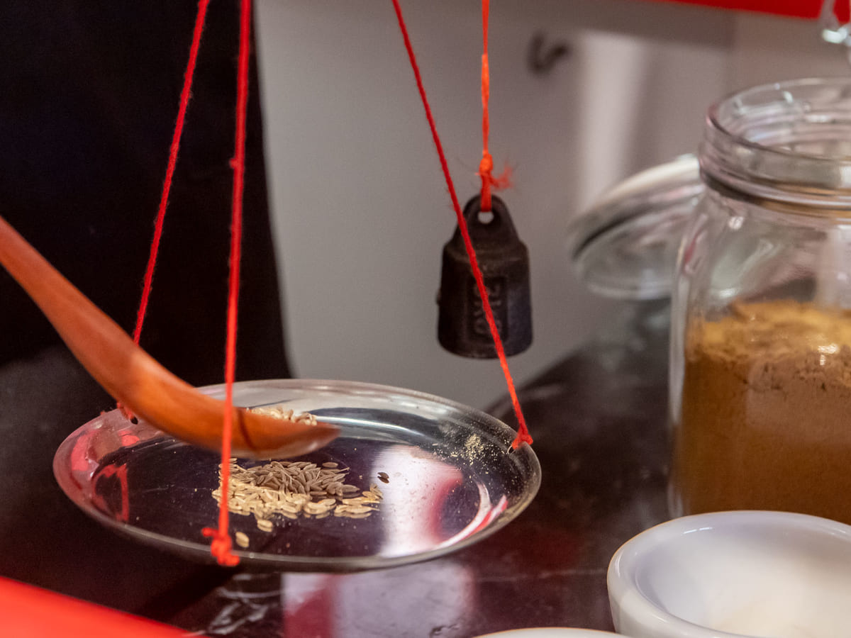 店内には20種以上のスパイスが並び、天秤を使ったスパイスの調合を見ることもできます。