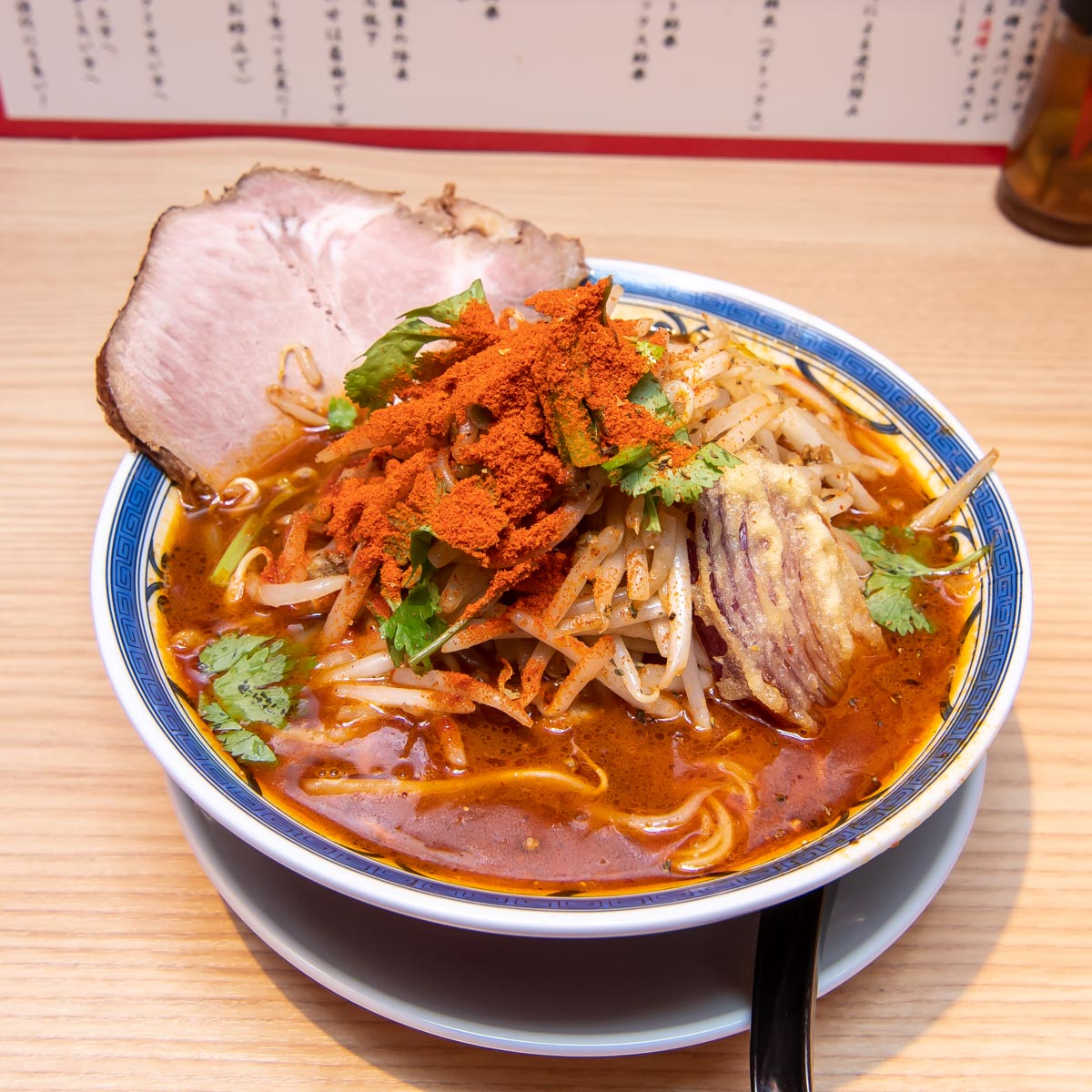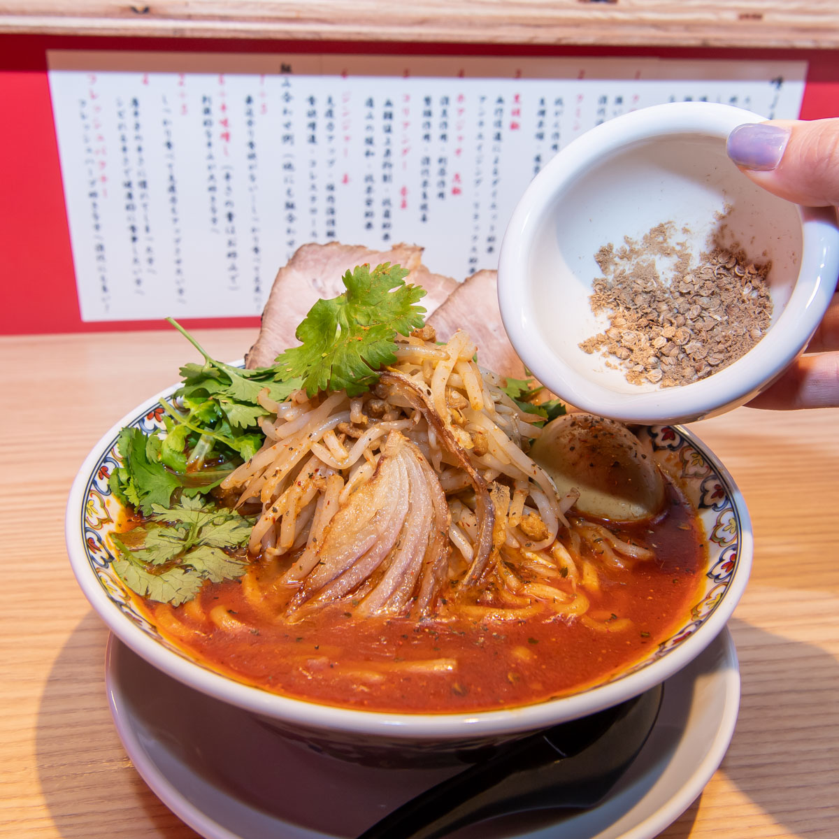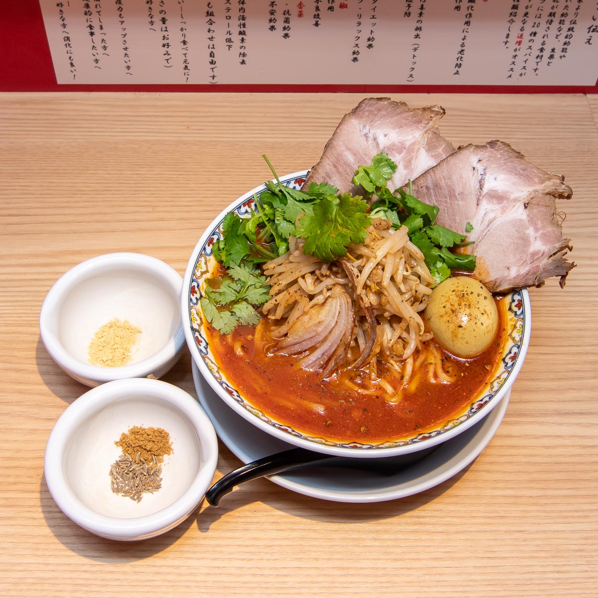 トッピングは叉焼(チャーシュー)、香菜(パクチー)に加え、炙りチーズ、半熟スパイス味玉、パクチー根の天ぷら、青葱、刻みニンニク、キーマ(肉味噌)など8種類。