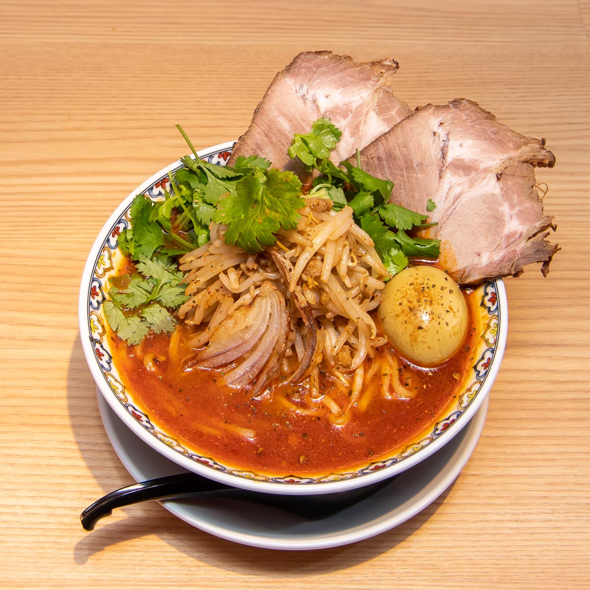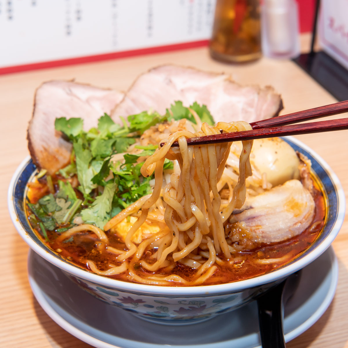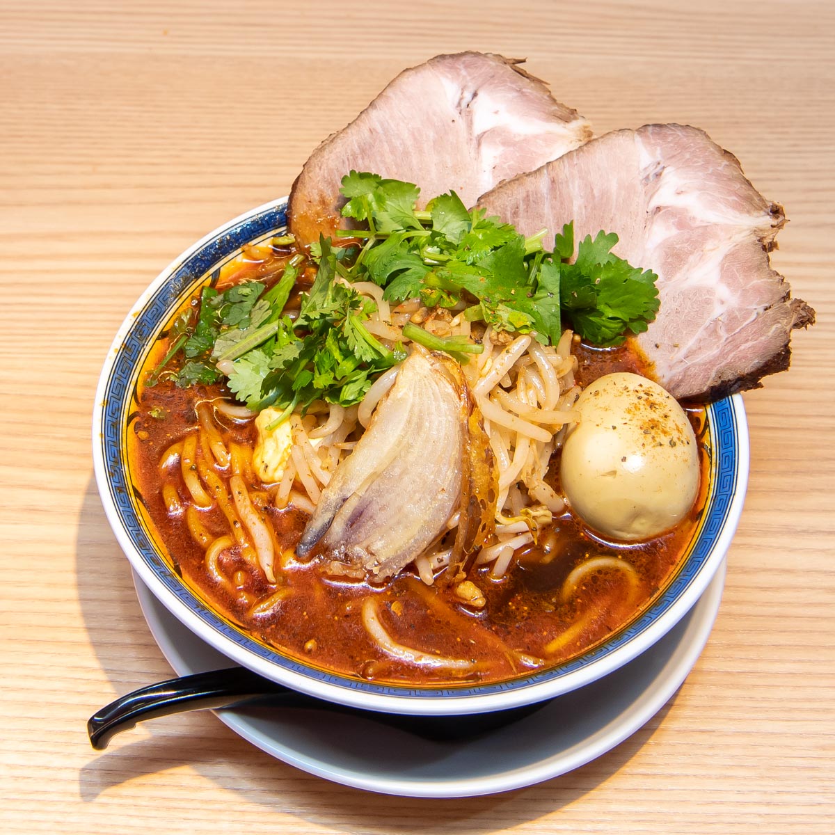 トッピングは叉焼(チャーシュー)、香菜(パクチー)に加え、炙りチーズ、半熟スパイス味玉、パクチー根の天ぷら、青葱、刻みニンニク、キーマ(肉味噌)など8種類。