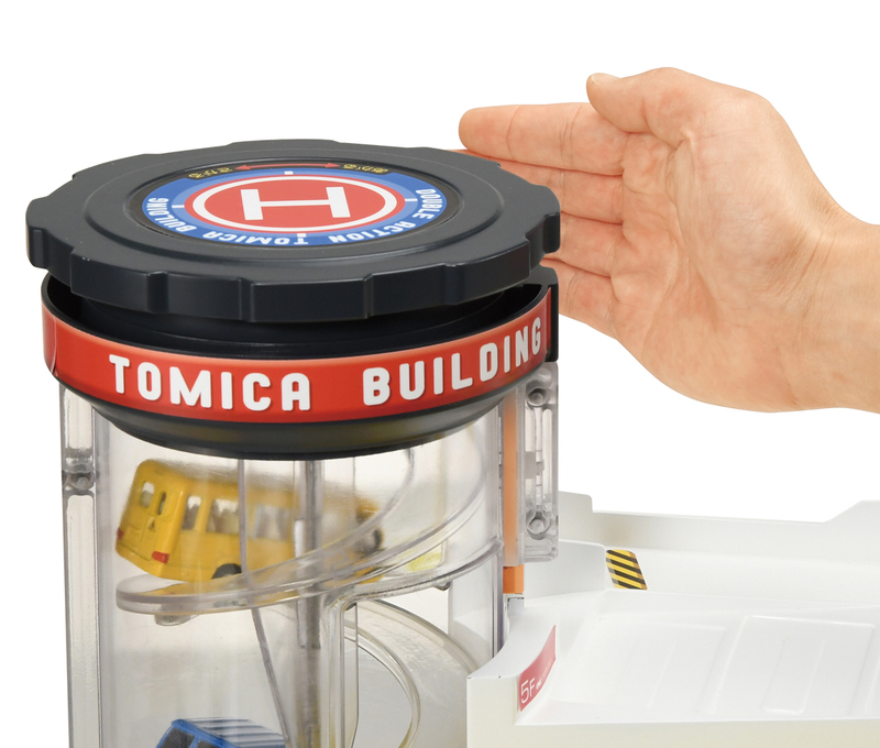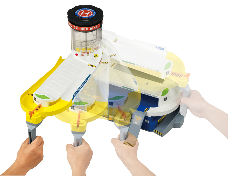 本体の5階建てのパーキングビル「ダブルアクショントミカビル」は、「トミカビル」としては史上初となる変形ギミックを搭載。