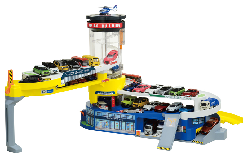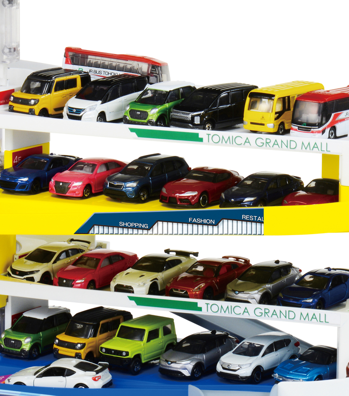 商品内容:本体(2階駐車場)、1階駐車場、3階駐車場、4階駐車場、4階カバー、5階駐車場、エレベーター、カーブレール(大)、カーブレール(小)、入口スロープ、可動スロープ、支柱(グリップ)、ストップバー、ノズル、屋上プレート、ラベル、取扱説明書、50周年記念特別仕様特典(接続どうろ、50周年記念ぬりえ、スペシャル動画アクセスチケット)