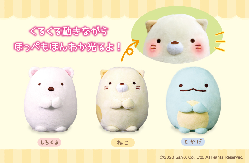 しろくま、ねこ、とかげのくるくる動くかわいいぬいぐるみ!ティーズファクトリー「ほっぺも光るよ!くるりんすみっコぐらし」