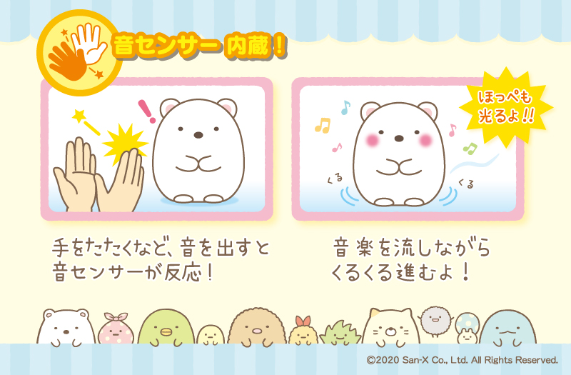 のんびりとした「すみっコぐらし」の音楽が流れて、ほっぺをゆっくり点滅させながらくるくる楽しく動きます。