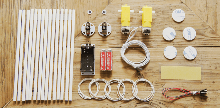 セット内容:紙ストロー(15本)、輪ゴム(20本)、モーター(2個)、電池ケース、単三電池(2本)、スイッチ(2個)、両面テープ(5枚)、目シール(2個)、コード(2本)、テープ(1枚)
