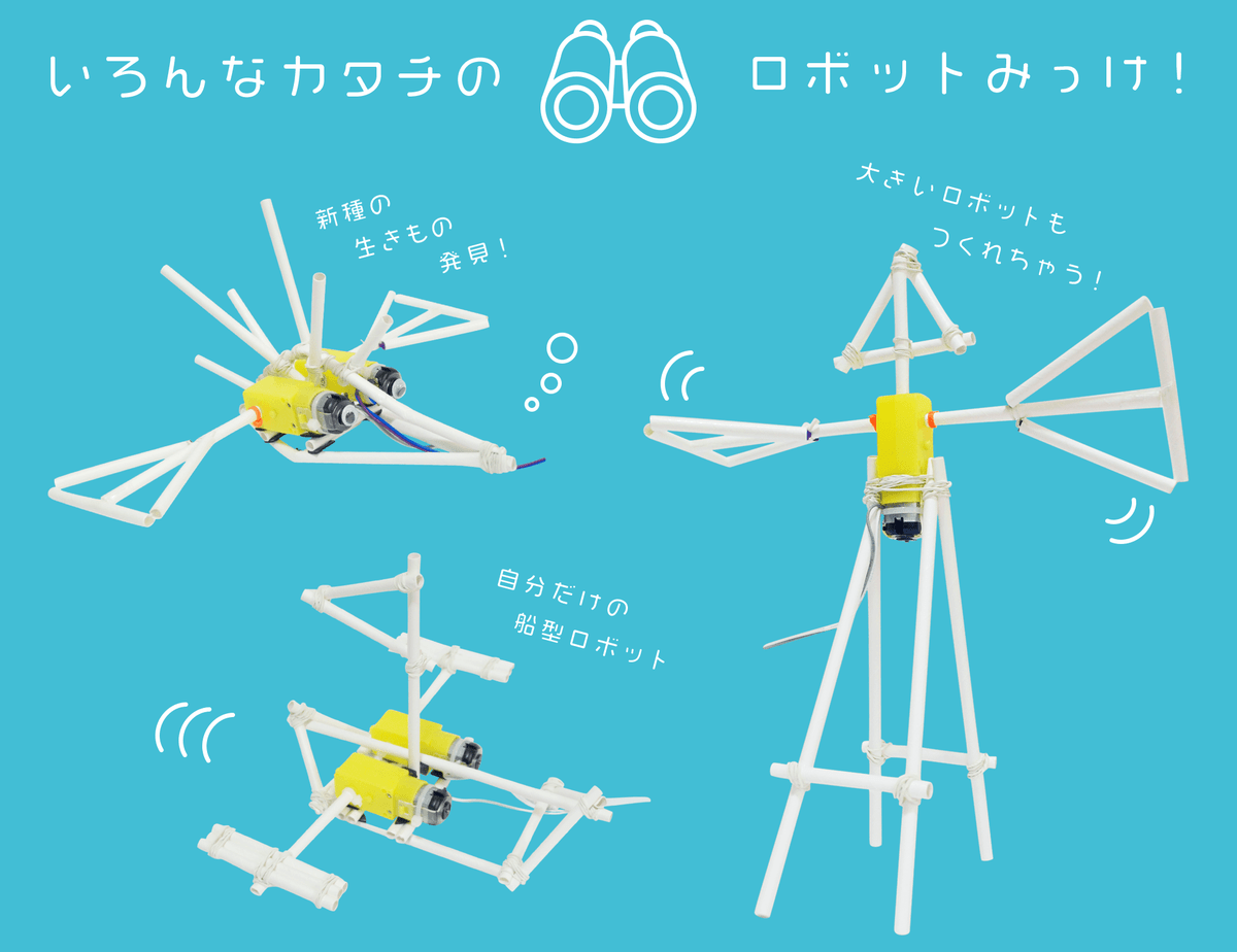 紙ストローや輪ゴムを使って、自由な発想で自分だけのロボットが作れるキット。
