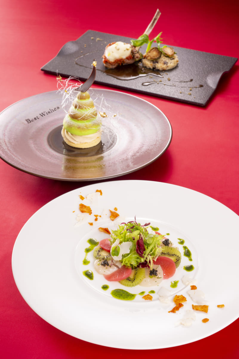 クリスマスのギフトボックスをモチーフにしたデザートが楽しめる「エメラルド」コースも提供されます。