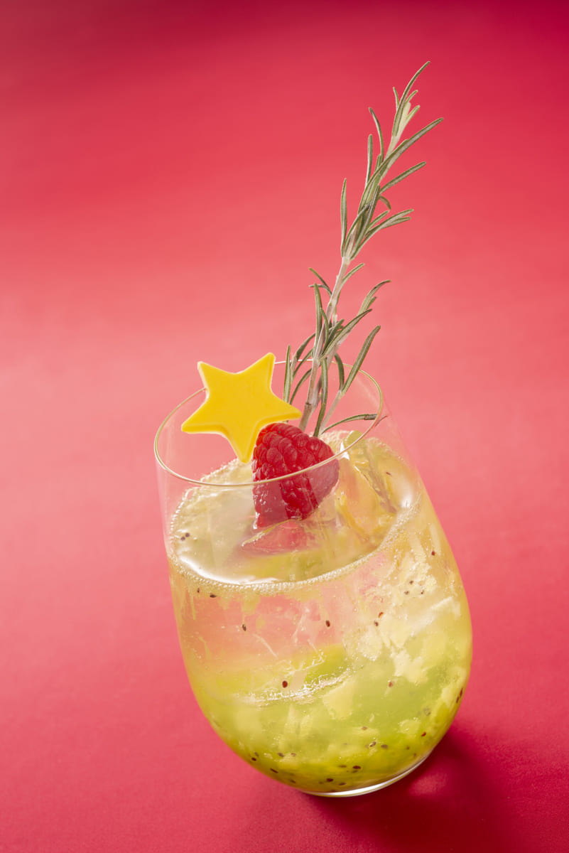 キウイフルーツ、パッションフルーツシロップ、アップルパイシロップ、クラブソーダ、フレッシュレモンジュース、チョコレート、ラズベリー、ローズマリー