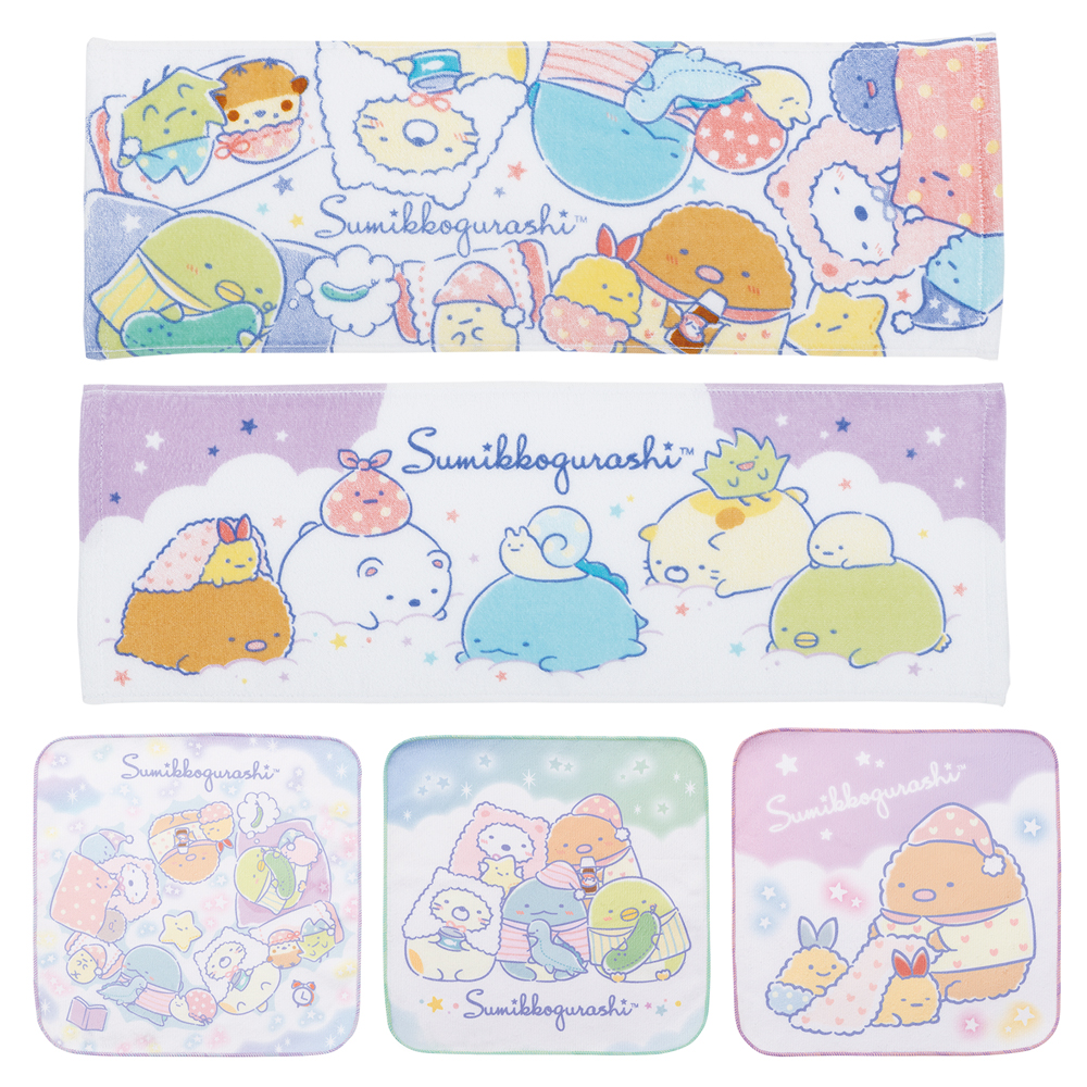フェイスタオルとハンドタオルから、好きなタイプが選べるG賞の「おやすみっコタオルコレクション」