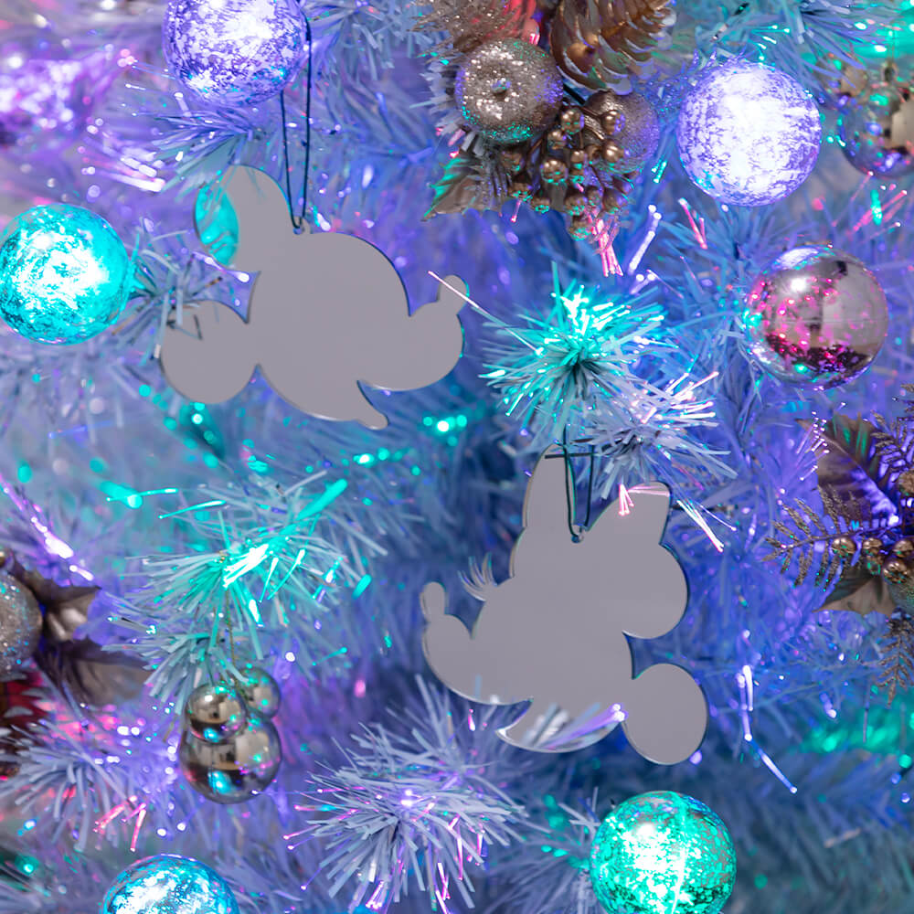 「ミッキー」と「ミニー」のシルエットをモチーフにしたオリジナルのミラーオーナメントをメインに、ミッキーシェイプのオーナメントとシャンパンゴールドのアーティフィシャルフラワーピックでまとめたゴージャスな印象のクリスマスファイバーツリー。