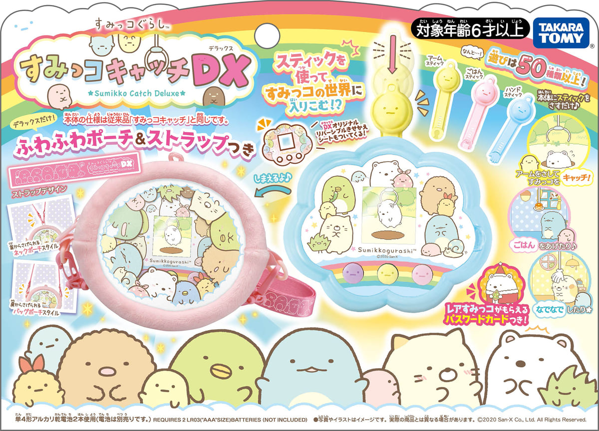「すみっコキャッチ」に、「ふわふわポーチ&ストラップ」、DX版オリジナルの「リバーシブル着せ替えシート」、レアキャラをゲットできる「ひみつのパスワードカード」の3つが付属。