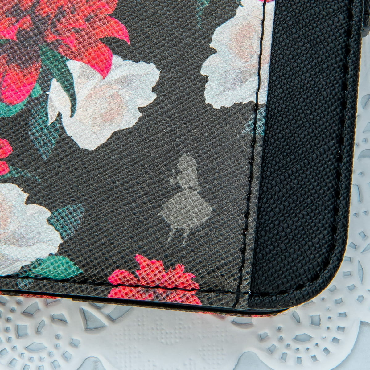 黒地に紅白の花が艶やかな総柄に、ゴールドパーツが高級感を演出。