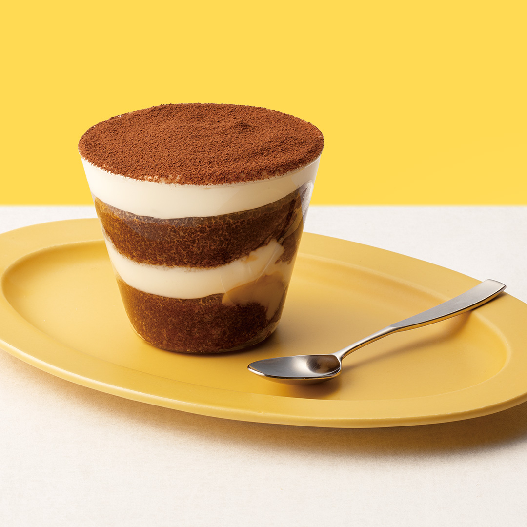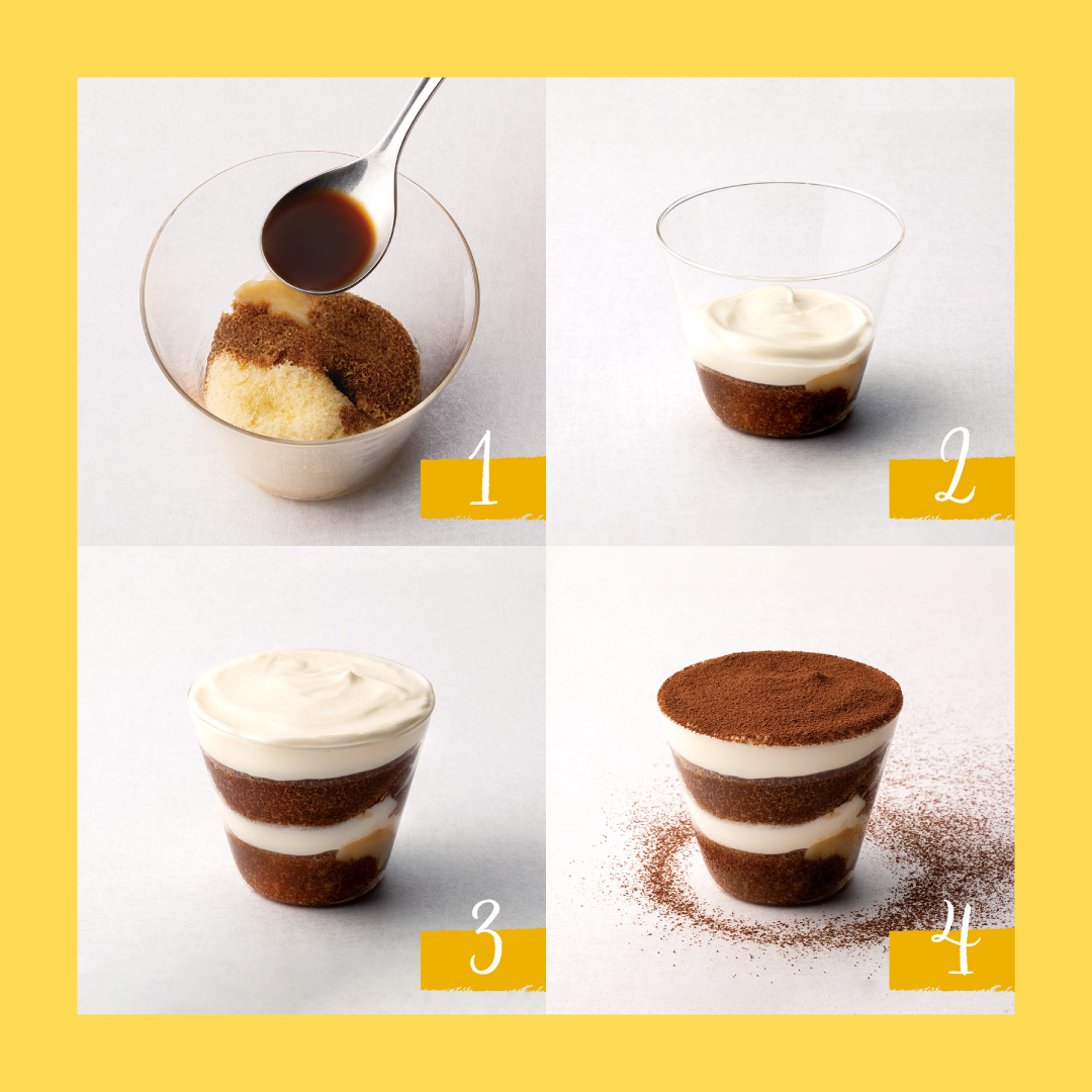 コーヒーと混ぜて、マスカルポーネチーズとココアパウダーと重ねれば「東京ばな奈ティラミス」に。