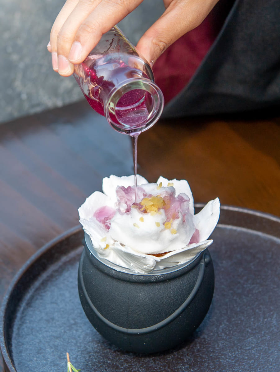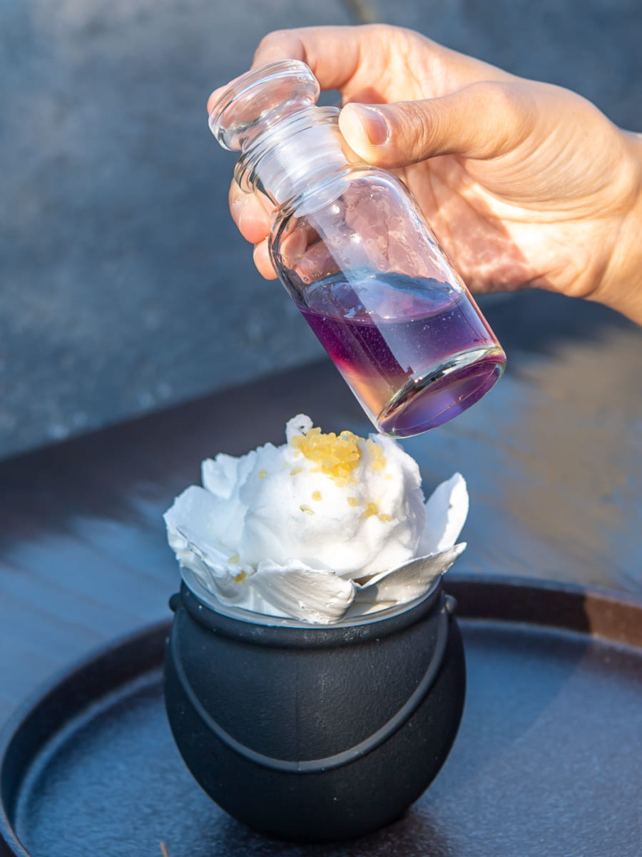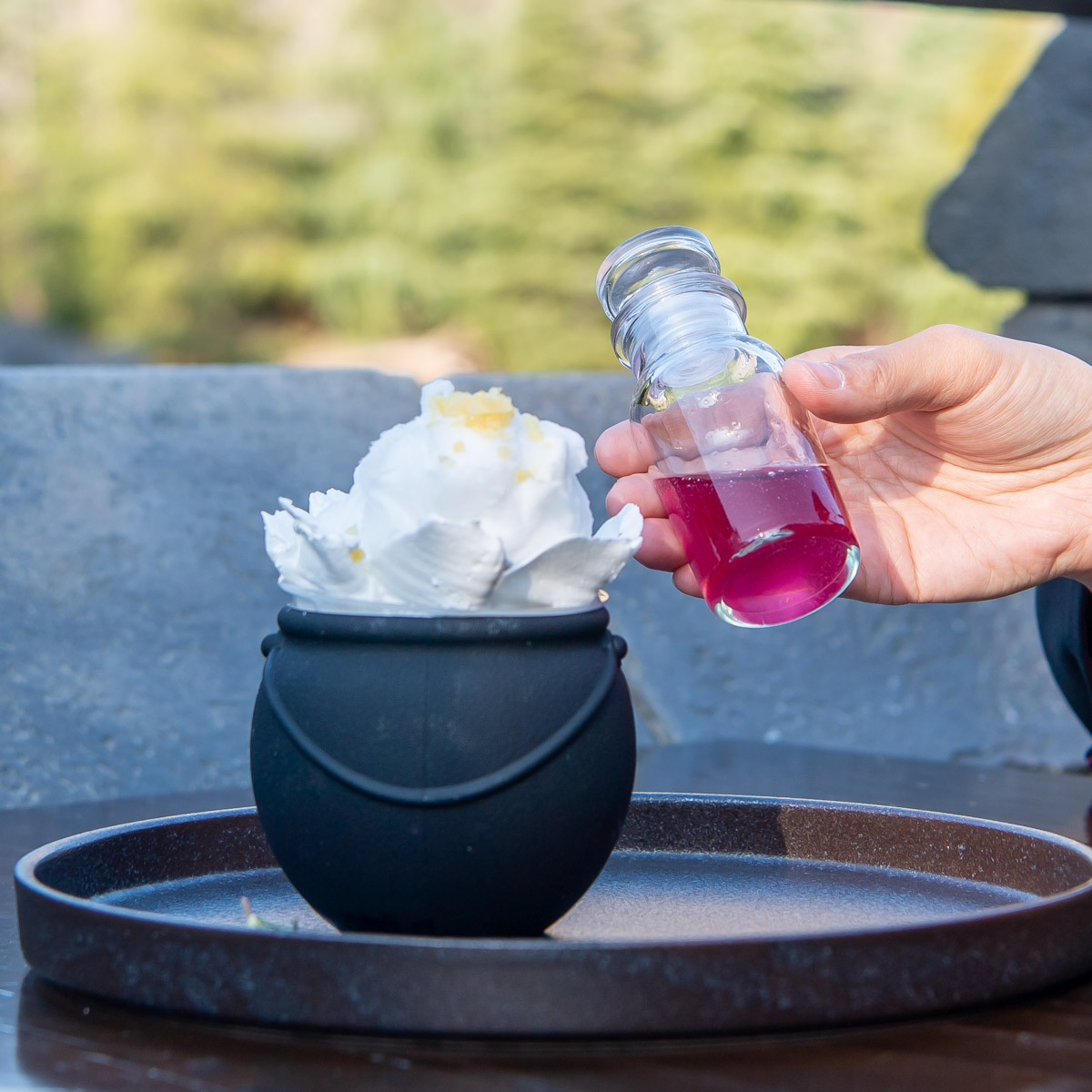 色の変化を楽しんでから魔法鍋に入れると、中から美味しいデザートが出現!