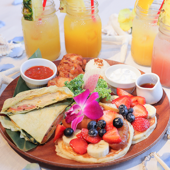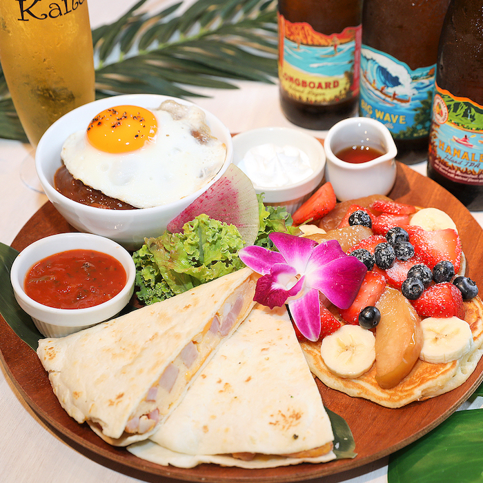 内容:オリジナルパンケーキ、スモークサーモンケサディーヤ、モチコチキン&ライス、ミニサラダ、ソソフトドリンク・トロピカルドリンク・ビールのいずれかをセット
