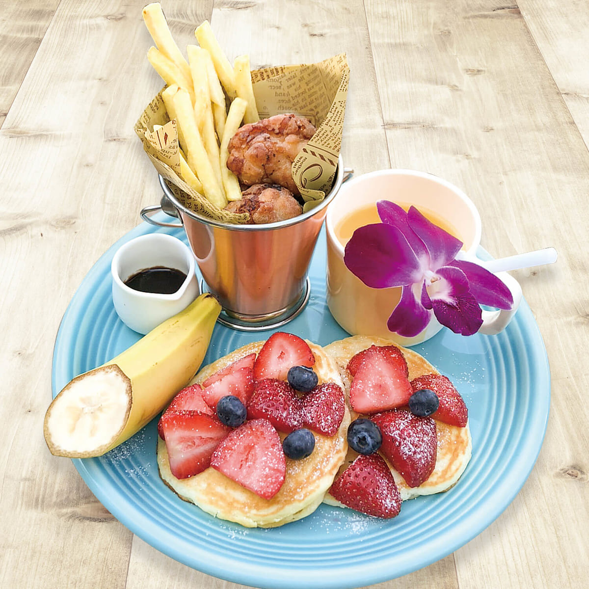 内容:オリジナルパンケーキ、ミートケサディーヤ、ミニロコモコ、ミニサラダ、ソフトドリンク・トロピカルドリンク・ビールのいずれかをセット