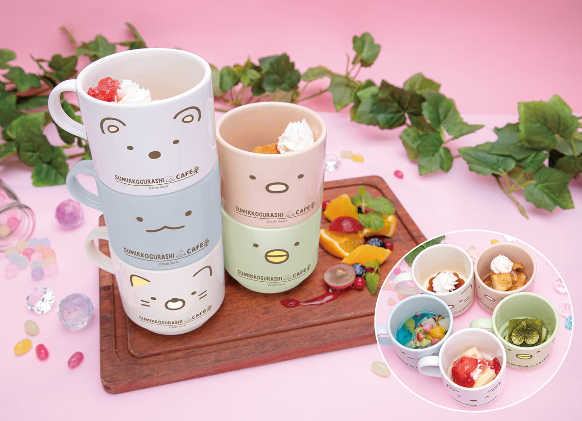 「すみっコ」たちのマグカップに少しずつデザートが盛りつけられています。