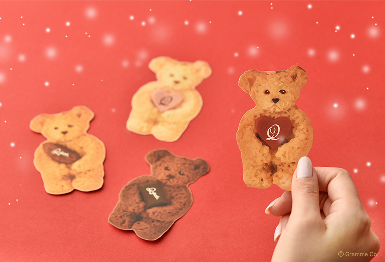 ひとかけらの板チョコレートやアムールショコラ、アーモンドを大切そうに“ぎゅっ”と抱きしめる、個性豊かな愛くるしい“テディベア”がデザインされています。