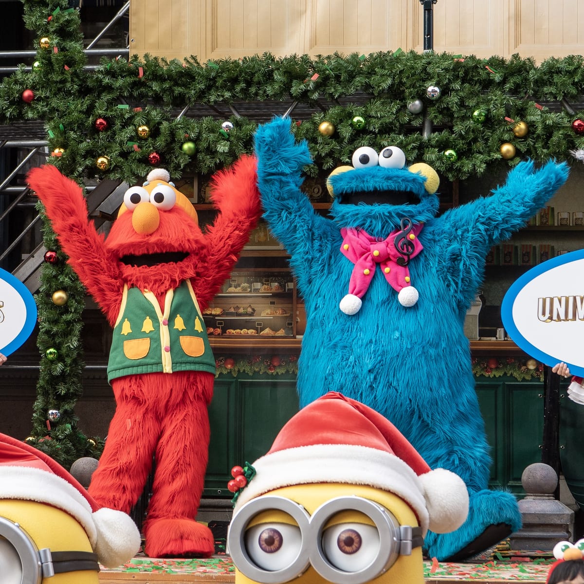 ハチャメチャなクリスマス装飾のミニオン・パークで、クリスマス・コスチュームのミニオンたちのグリーティングが楽しめます☆