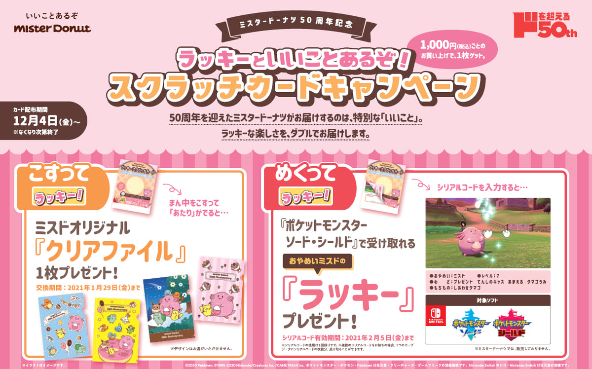 キャンペーン期間中、ミスタードーナツで税込み1,000円購入ごとに「ラッキースクラッチカード」1枚がもらえます。