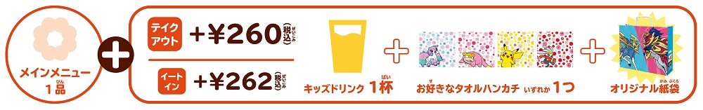 メインメニュー1品にドリンクとグッズが付いてくる人気メニュー「キッズセット」に、ミスタードーナツオリジナルデザインの「ポケモン タオルハンカチ」が登場!