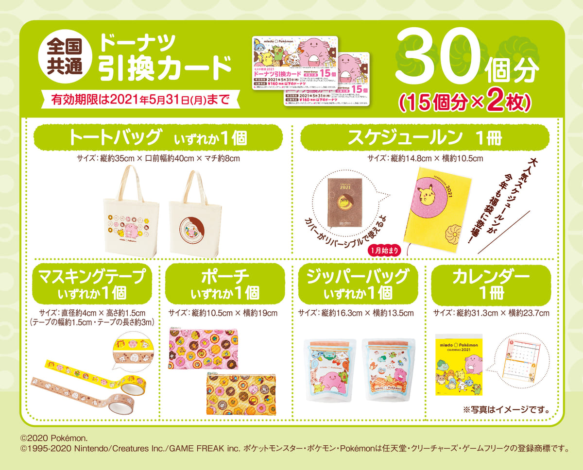 内容:全国共通ドーナツ引換カード30個分(10個分×3枚)、トートバッグ2種のうちいずれか1つ、ポーチ2種のうちいずれか1つ、マスキングテープ2種のうちいずれか1つ、ジッパーバッグ2種のうちいずれか1つ、カレンダー1冊、スケジュールン1冊