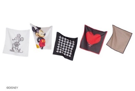 スタンディングミッキーの素朴なデッサンがコットン生地にプリントされた無垢でシンプルなものから、クラシクス・ザ・スモールラグジュアリならではのデザイン手法を用いたものまで、様々なデザインが施されています。