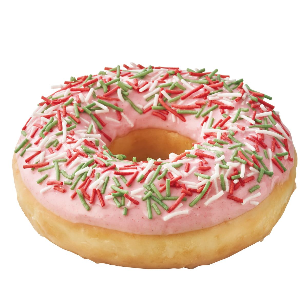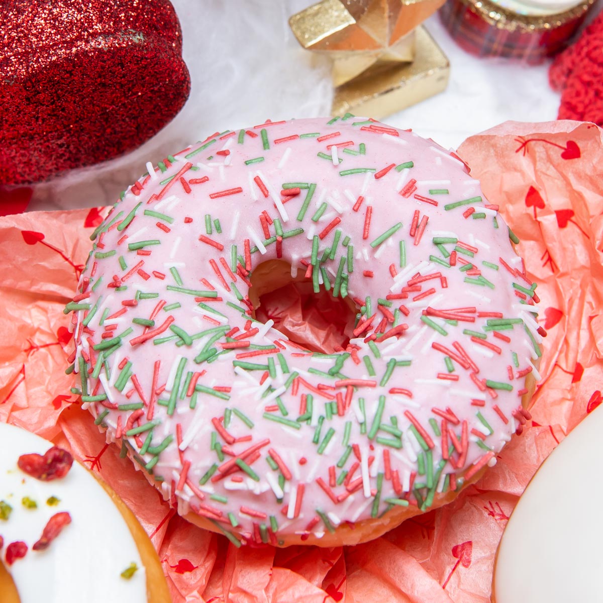 ストロベリーチョコでコーティングしたオリジナル・グレーズドに、クリスマスカラーのキャンディスプリンクルをたっぷりトッピング!