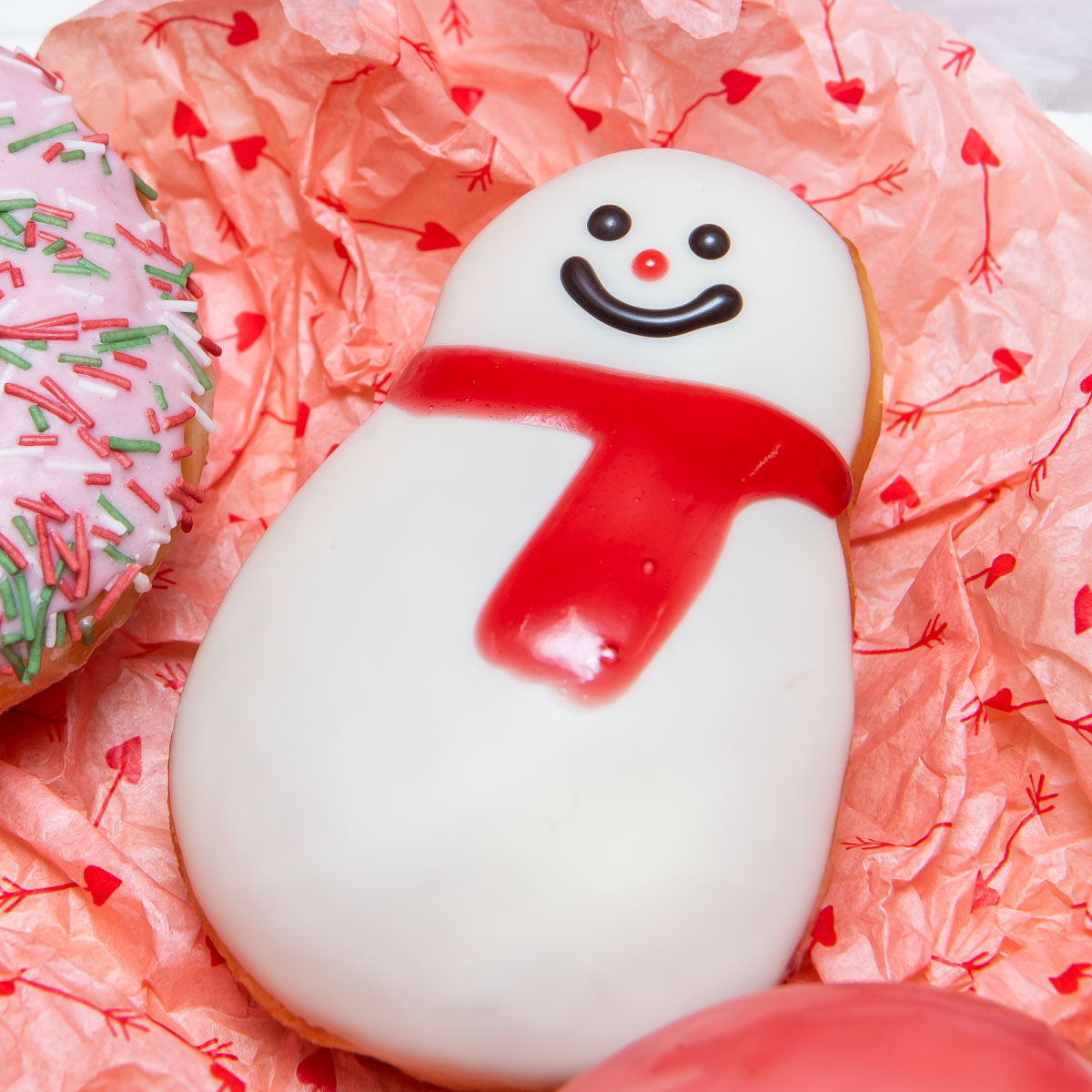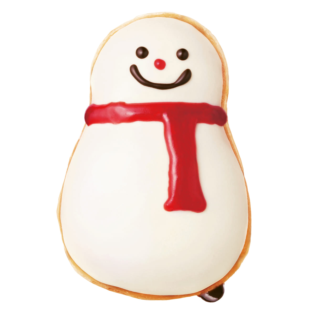 雪のように真っ白でミルキーなホワイトチョコをコーティングし、ビターチョコでスマイルが描かれた、かわいいドーナツです。