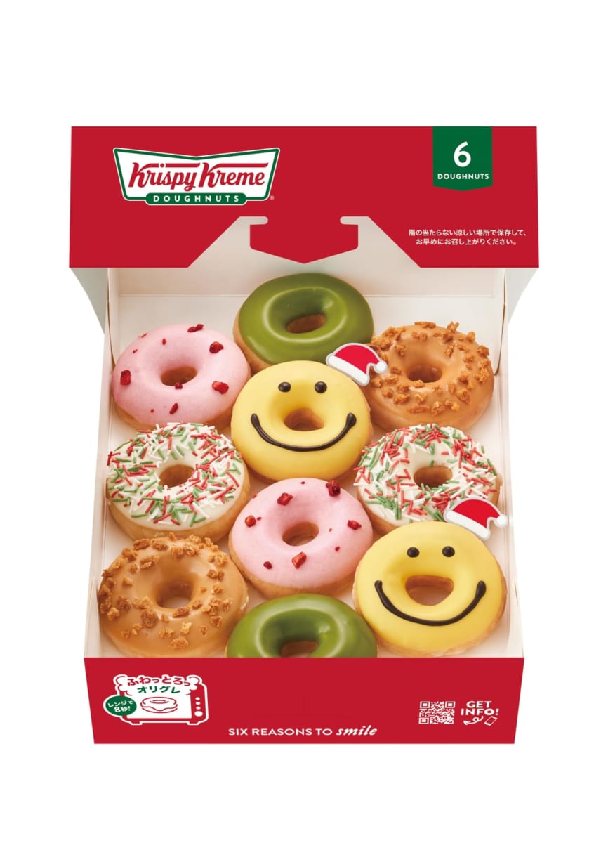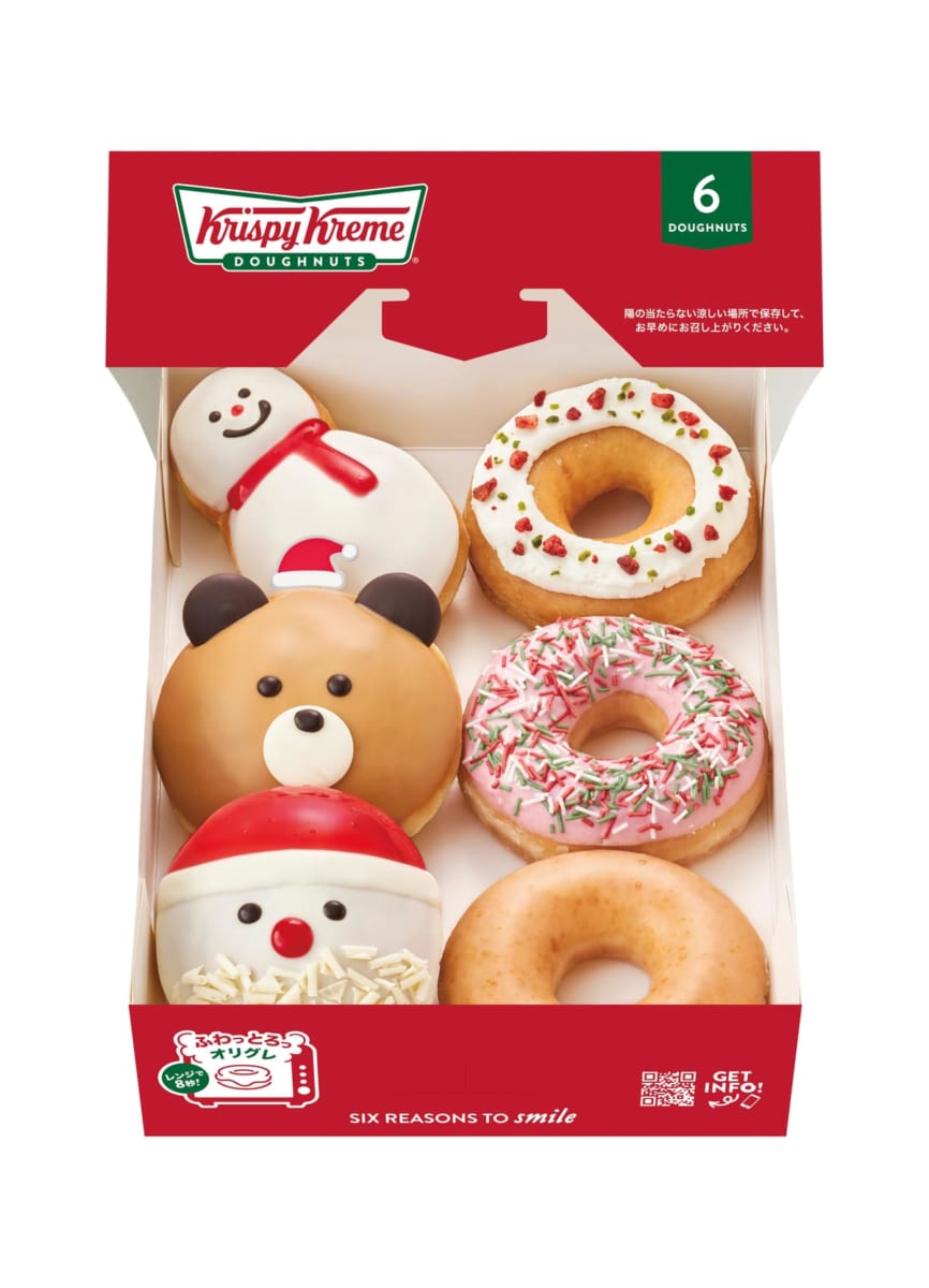 デビューしたてのキュートなクリスマスベアをはじめ、サンタとスノーマン、スプリンクルにチーズのリングと人気のオリジナル・グレーズド®が集まった、100円お得な6個入りセット。