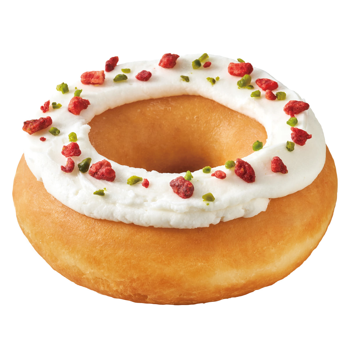 マスカルポーネ入りの雪のようなチーズクリームに、真っ赤なフリーズドライストロベリーと鮮やかなグリーンのピスタチオをトッピング、上品なホリデーカラーに仕上げたリングドーナツ。