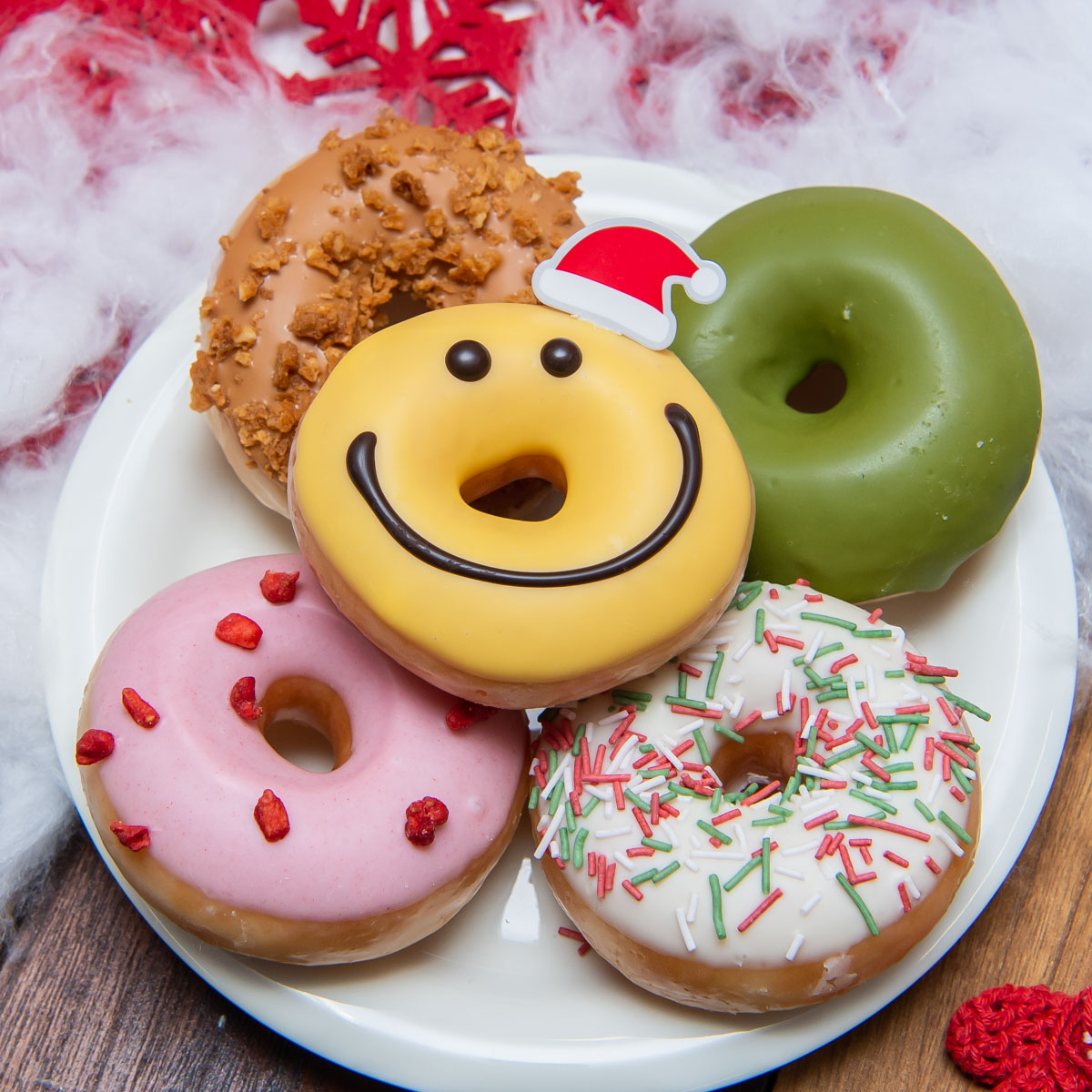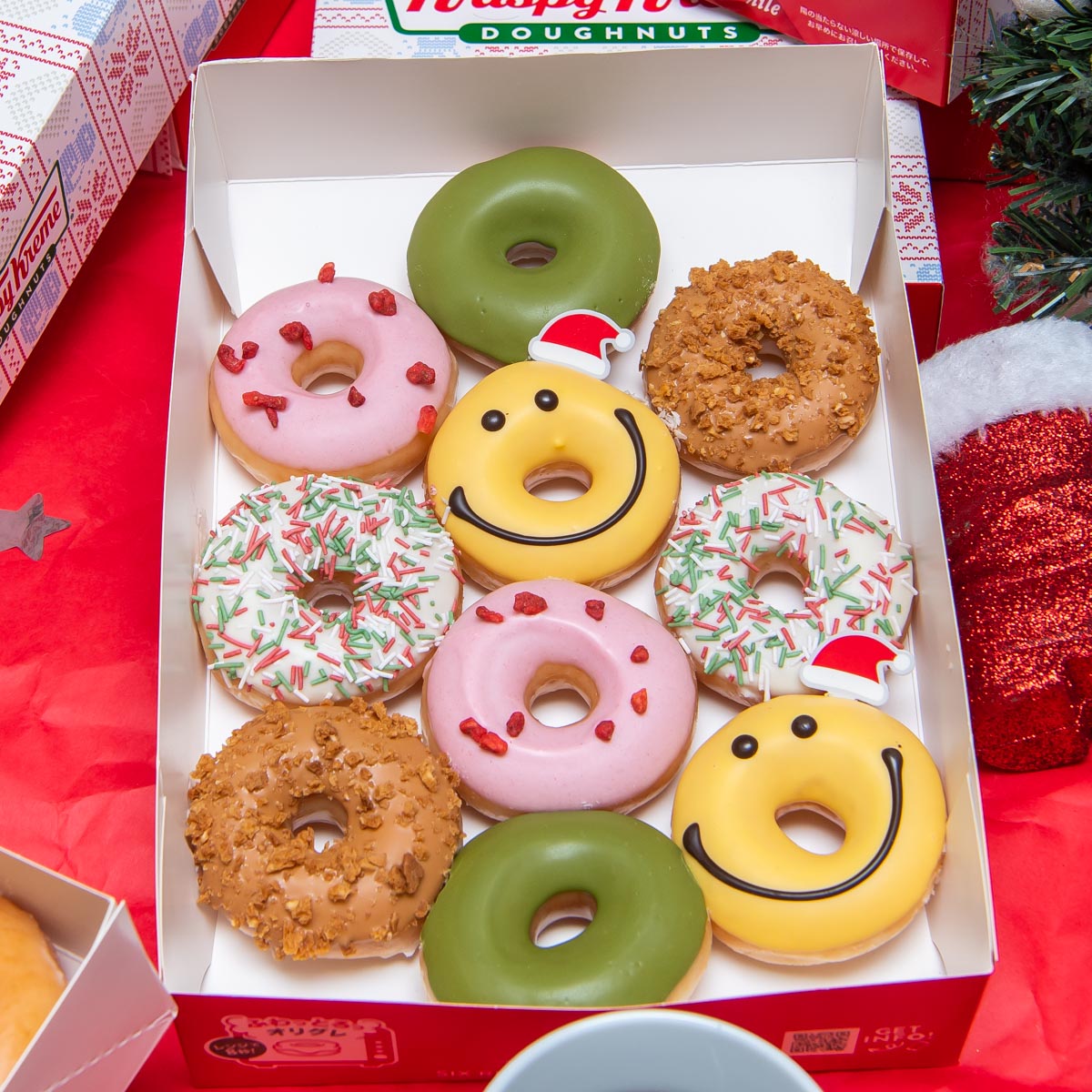 イチゴのサンタ、チョコレートのスノーマン、ホリデーカラーのスプリンクル、チーズのリングと人気No.1の「オリジナル・グレーズド」