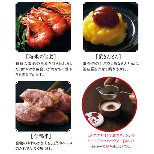 「ミッキー」シルエットの栗きんとんを中央に、炊き合わせや酢の物など定番料理が盛り付けられています。