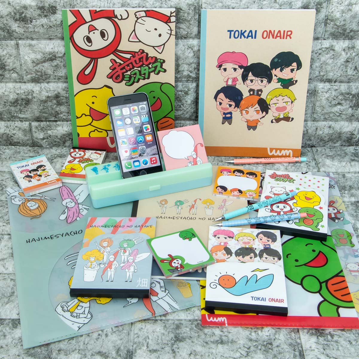 ポップなアレンジが施された「はじめしゃちょーの畑」と「まいぜんシスターズ」「東海オンエア」デザインのステーショナリー。